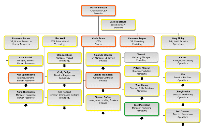 ● Elevated communication and collaboration–Many of the C-suite positions have overlap in their responsibilities or require collaboration with other executives to ensure all operations are on the same page. An ability to visualize the executive leadership structure promotes successful collaboration within the team.