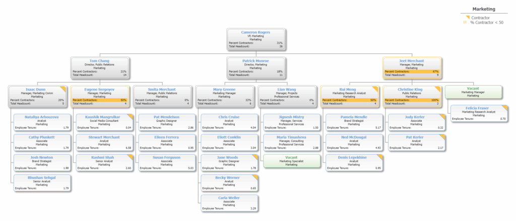 OrgChart lets you highlight contractors and their positions, from key managers to individual contributors, allowing you to see their impact across your organization.